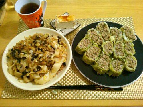 晩ごはん 大皿にどーん。お切り込みうどんを使って焼きうどんを作ってみました。 具はキャベツ、玉ねぎ、木耳。ソースはもちろんおたふく。キャベツシュウマイはこちらの動画を参考にしました。↓↓ https://youtu.be/U7sPObmZ8Y4レンジで楽チン。私的には手が…