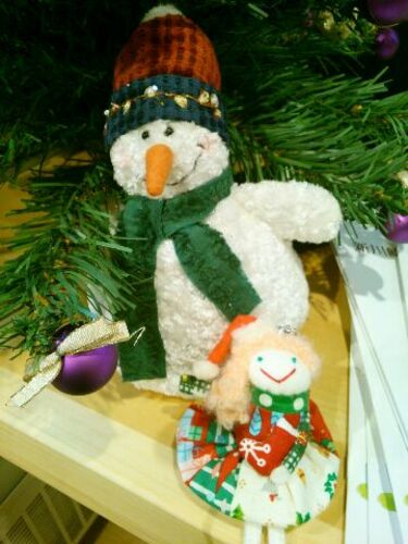 レジ前に小箱ショップのオーナーさんが持ってきたツリーとスノーマンと女の子が飾ってあります。可愛い&楽しい♪(*^^*) ツリーのオーナメントがふぁんたじっく。サンタの横顔が三日月♪(*^^*)